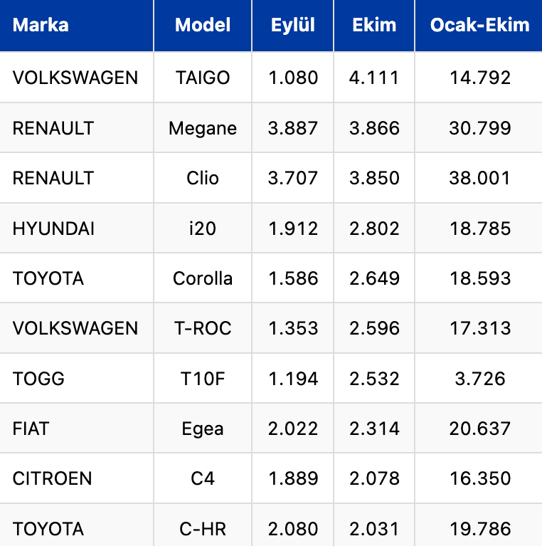 ODMD verilerine göre, 2025’in eylül ve ocak-ekim döneminde en çok satılan ilk 10 otomobil şöyle: