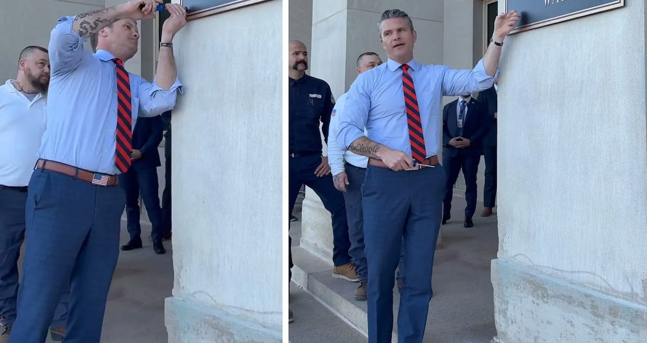 Bakanlığın sosyal medya hesaplarında paylaşılan videoda, Savunma Bakanı Pete Hegseth’in yeni levhayı kendi elleriyle vidaladığı görüldü. Hegseth, bu hamlenin sembolik önemine dikkat çekerek: